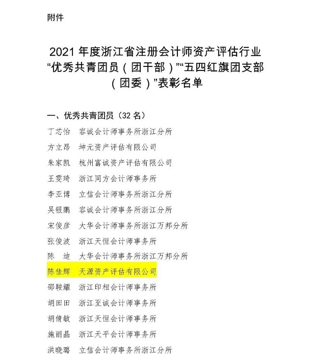 为表彰先进、树立典型,激励执业机构团组织和广大团员青年继续争先创优,共青团浙江省注册会计师行业委员会近日发布了《关于表彰2021年度浙江省注册会计师资产评估行业“优秀共青团员(团干部)”“五四红旗团支部(团委)”的决定》,我公司两名年轻资产评估师陈佳辉和谢伟被评为2021年度浙江省注册会计师资产评估行业“优秀共青团员”。