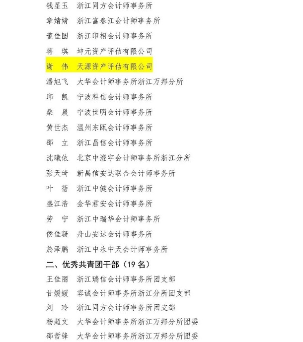热烈祝贺我公司陈佳辉、谢伟被评为2021年度浙江省注册会计师资产评估行业“优秀共青团员”