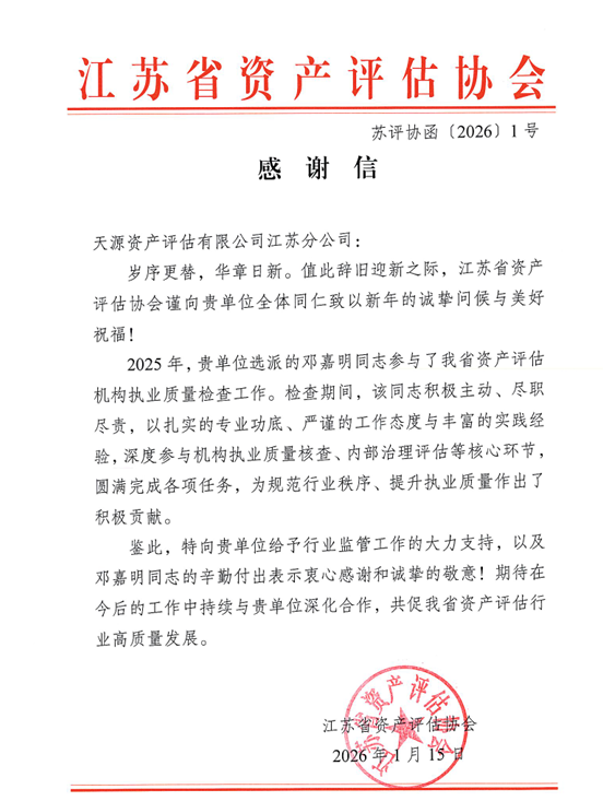 近日,江苏省资产评估协会发来感谢信。对我司在江苏省资产评估机构执业质量检查及行业监管工作中提供的积极支持表示衷心感谢,并高度认可邓嘉明同志在质量检查工作中所展现出的突出贡献。信中指出,邓嘉明同志在参与江苏省资产评估机构执业质量检查工作的过程中,积极主动、尽职尽责,以扎实的专业功底、严谨的工作态度与丰富的实践经验,深度参与机构执业质量核查、内部治理评估等核心环节,圆满完成各项任务,为规范行业秩序、提升执业质量作出了积极贡献。行业协会的认可充分展现了天源的专业能力与敬业精神,未来,我司将继续积极参与行业协会的各项工作,为推动资产评估行业高质量发展贡献更多力量。