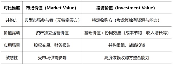 与假设在公开市场上对所有潜在投资者都适用的市场价值不同,投资价值衡量的是资产对于特定投资者而言的价值。其核心差异在于对 “协同效应” 的考量。